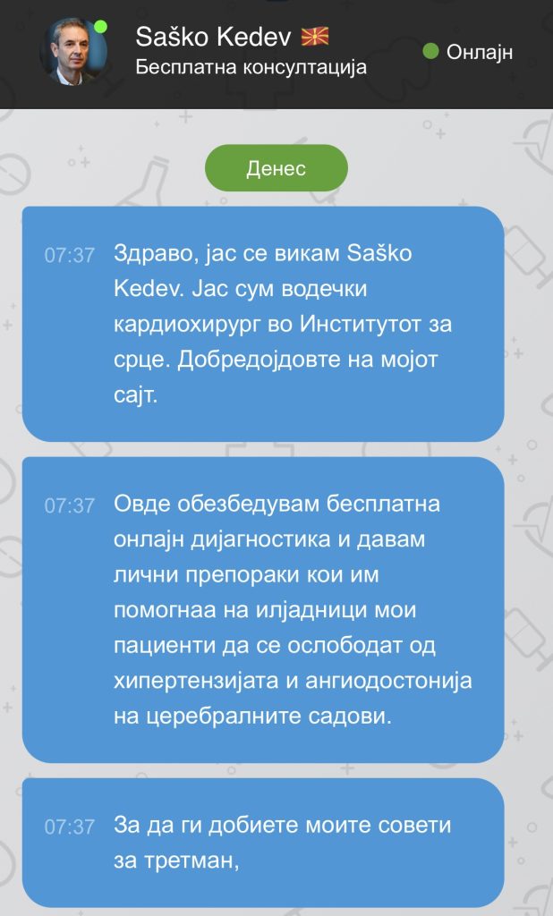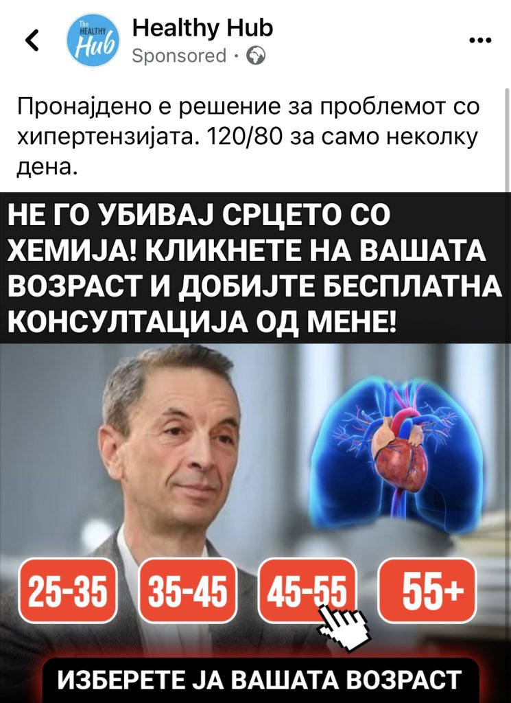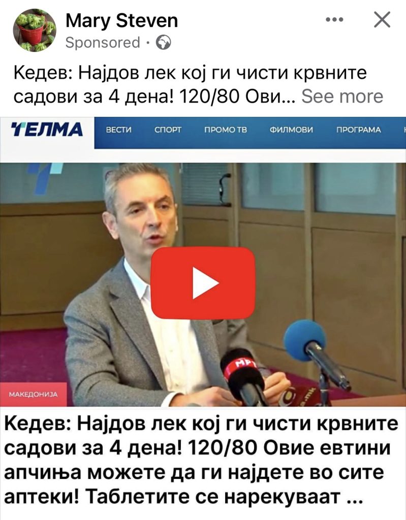 Të shpeshta janë lajmet e rrejshme edhe për medikamente shëndetësore. Në “filtrin” e Flaka ra një postim i sponsorizuar në Facebook. Një faqe enigmatike me emër e mbiemër të rrjeshëm dhe me ueb link të dyshimt që mban emrin “Mary Steven”, propagandon një llojë hapash për kardiologji duke keqpërdorur emrin e kardiologut të njohur nga Maqedonia e Veriut, Sasho Kedev.