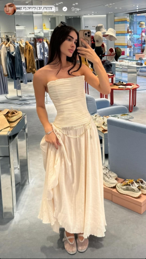Fustani i bardhë, i cili thekson linjat e saj unike dhe i jep pamjes një nuancë freskie dhe sofistikimi.