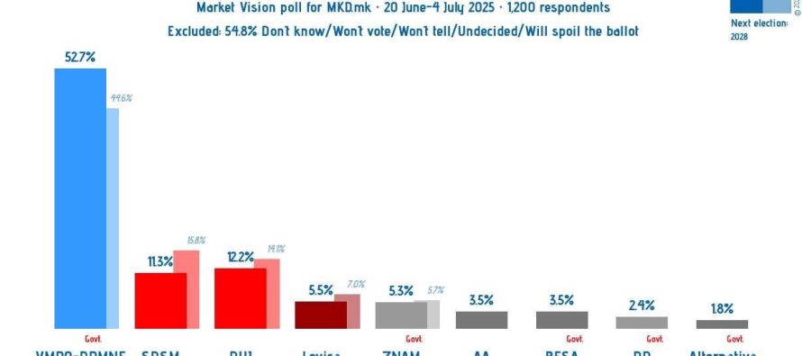 Ndërkohë, në kampin maqedonas, VMRO-DPMNE udhëheq me 53%, duke lënë pas LSDM-në me 11% dhe LEVICA-n me 6%.