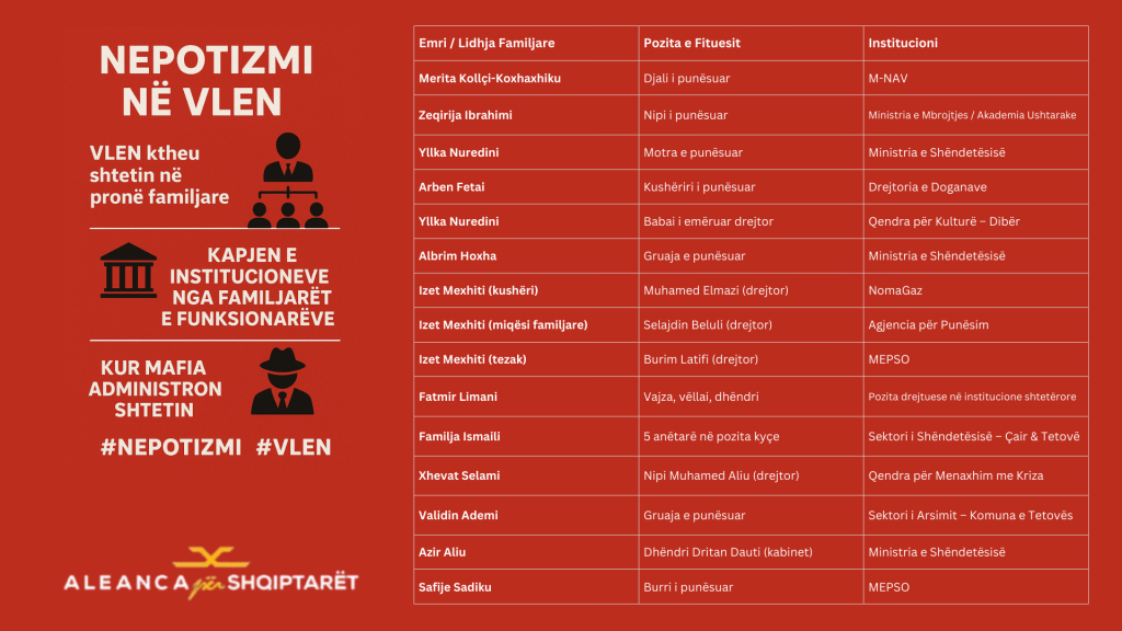 Aleanca për Shqiptarët shpreh shqetësimin e thellë për fenomenin e shndërruar në praktikë qeverisëse nga koalicioni VLEN – nepotizmin masiv dhe kapjen e institucioneve nga familjarët e funksionarëve të tyre politikë.