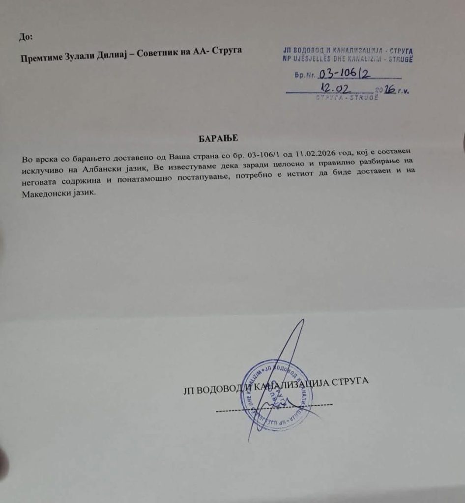 Ai ka shtuar se: “Edhe pse ekziston ligji që qartë garanton përdorimin e gjuhës shqipe, një ndërmarrje publike në Komunën e Strugës i kërkon një këshilltareje që kërkesën ta dorëzojë në maqedonisht, me arsyetimin ‘që ta kuptojnë saktë dhe drejt’.”