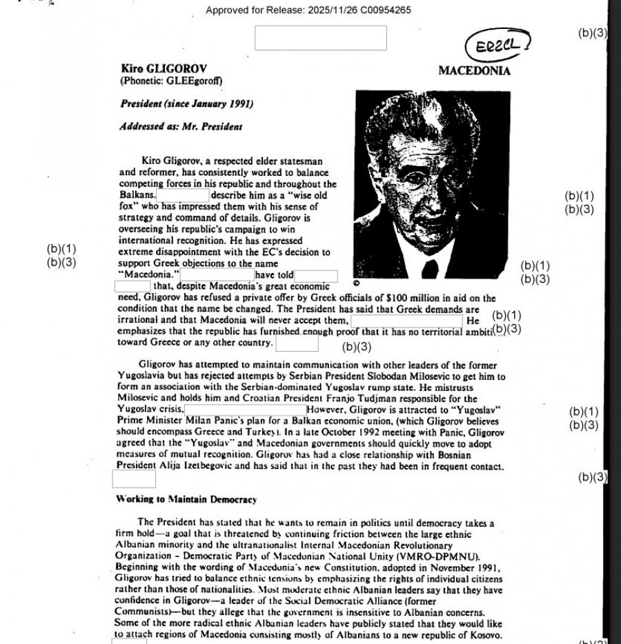 Një dokument i deklasifikuar i Central Intelligence Agency (CIA) hedh dritë mbi vlerësimet amerikane për situatën politike në Maqedonia e Veriut në fillim të viteve ’90 dhe rolin e presidentit të atëhershëm Kiro Gligorov, shkruan Gazeta Flaka.