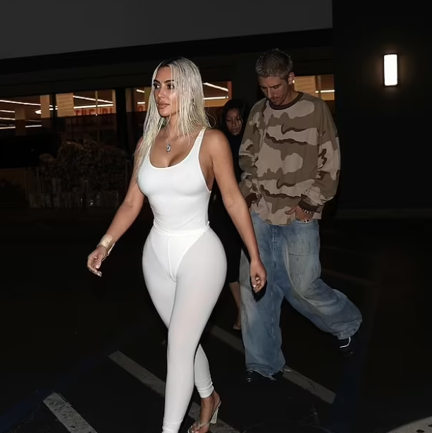 Në foto, një bionde Kim – e cila aktualisht është në New York me vajzën North – shihet duke dalë nga një treg ushqimor në Los Angeles me një triko të bardhë dhe gete të ngjashme.