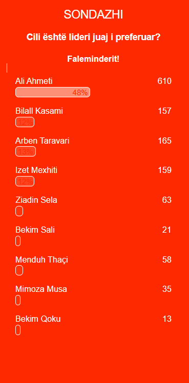 Sipas sondazhit të realizuar nga Flaka, ku morën pjesë gjithsej 1281 votues, qytetarët kanë dhënë opinionin e tyre për liderin e preferuar politik. Rezultatet tregojnë një epërsi të qartë të liderit të BDI-së, ndërsa gara për vendet tjera mbetet më e afërt, transmeton Gazeta Flaka.
